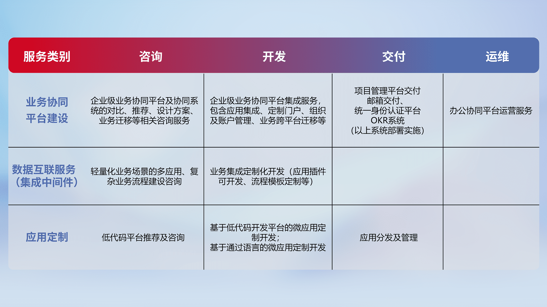 针对钉钉、、、企微、、、IDaas等平台级产品提供产品的规划、、、方案、、、交付、、、定制化开发等服务,,实现如统一协同办公、、、、智能客户服务、、混合会议管理、、、智能数据查询、、等业务场景,,实现数字化转型。。